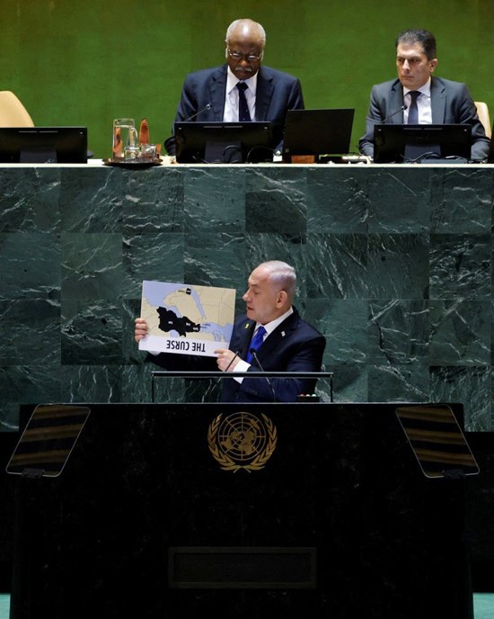 واستعرض نتنياهو خريطتين للدول التي يعتبرها الاحتلال صديقة وهي مصر والأردن والسعودية والإمارات".