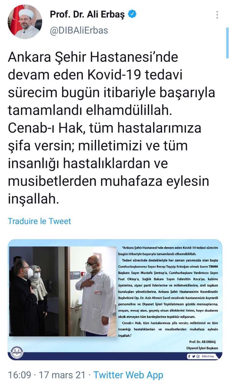 أعلن رئيس الشؤون الدينية والأوقاف التركي، البروفيسور علي أرباش، عن شفائه من فيروس كورونا، ب مرور نحو أسبوعين على الإصابة.