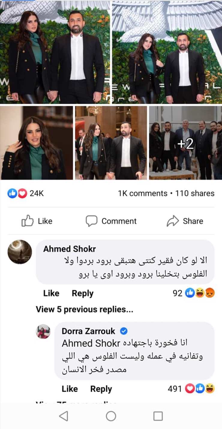 يذكر أن درة نشرت عدة صورة جديدة تجمعها بزوجها عبر حسابها الرسمي بموقع التواصل الاجتماعي الفيس بوك، وعلقت عليها قائلة: فخورة به، وتلقت تعليقا من أحد متابعيها قال فيه: هو لو كان فقير، كنتي هتبقي فخورة برضو، ولا الفلوس بتخلينا فخورين وفخورين أوي أوي.