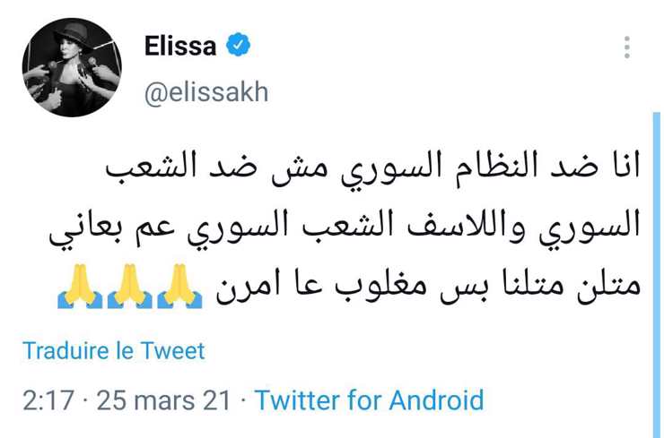 وأثارت تغريدة النجمة اللبنانية، استنكارا كبيرا من قبل موالي النظام، الذين اتهموها بالعنصرية، لترد عليهم أن كلامها موجه لنظام الأسد وليس للشعب السوري.