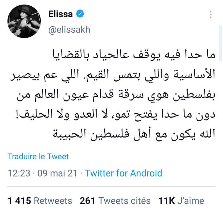 وجدّدت الفنانة اللبنانية إليسا، تأكيدها على موقفها الداعم دومًا لفلسطين، وغردت قائلة: " ما حدا فيه يوقف عالحياد بالقضايا الأساسية واللي بتمس القيم، اللي عم بيصير لفلسطين هوي سرقة قدام عيون العالم من دون ما حدا يفتح تمو، لا العدو ولا الحليف، الله يكون مع أهل فلسطين الحبيبة".