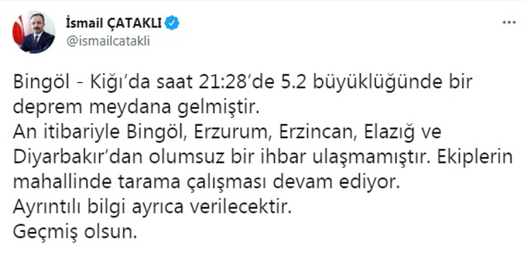 ووفقاً لوسائل إعلام تركية بحسب ما ترجمته نيوترك بوست،أشارت إلى أن المتحدث باسم وزارة الداخلية التركية “إسماعيل تشاتاقلي”أدلى ببيان على تويتر عن الزلزال الذي وقع في بينغول قال فيه إنه لم يتم تلقي أي إشعار سلبي من بينغول وأرزروم وأرزينجان وإلازيغ وديار بكر.
