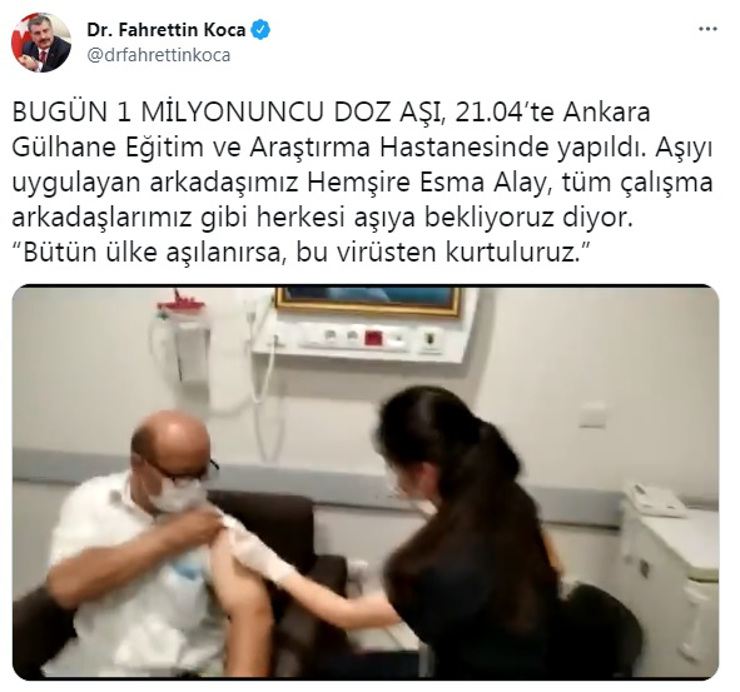 وأضاف الوزير قوجه بأن جرعة المليون تم إعطاؤها في مستشفى أنقرة جولهان للتدريب والبحوث في دراسات التطعيم التي أجريت اليوم ، وقال ، "اليوم ، تم إعطاء جرعة المليون من اللقاح في مستشفى أنقرة جولهان للتدريب والبحث في 21.04." إذا تم تطعيم البلد كله سنتخلص من هذا الفيروس ".