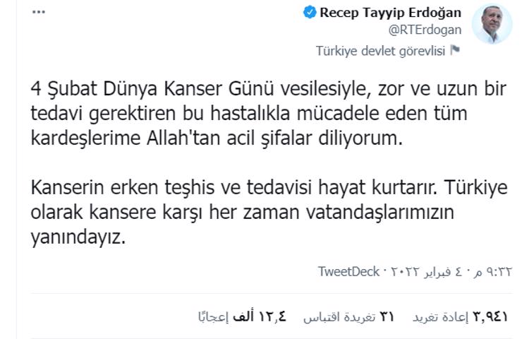 وجاء في تغريدة أردوغان: “بمناسبة يوم 4 فبراير، اليوم العالمي للسرطان، أتمنى من الله الشفاء العاجل لجميع إخواني وأخواتي الذين يعانون من هذا المرض الذي يتطلب علاجًا صعبًا وطويلًا”.