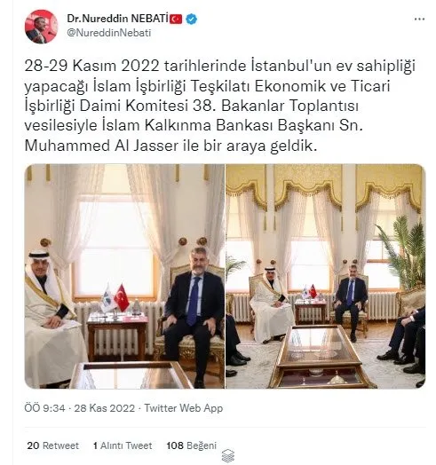وصرح وزير الخزانة والمالية في تدوينة على حسابه على تويتر أنه التقى رئيس البنك الإسلامي للتنمية الجاسر بمناسبة الاجتماع الوزاري الثامن والثلاثين للجنة الدائمة لمنظمة التعاون الإسلامي للتعاون الاقتصادي والتجاري (الكومسيك) التي ستستضيفها اسطنبول. في 28-29 نوفمبر.